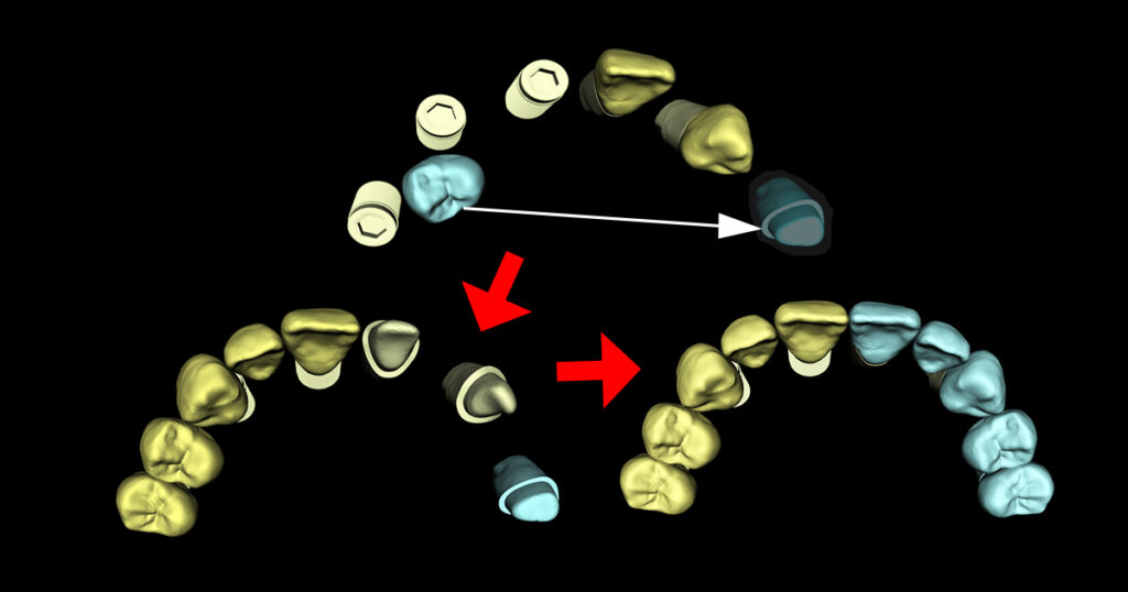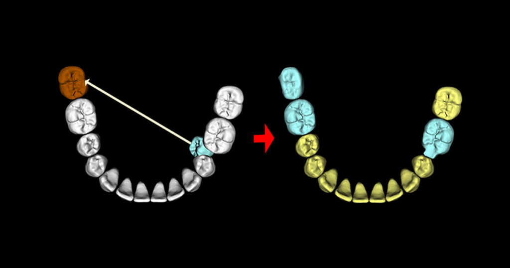 下顎前歯矯正により抜歯される前歯を小臼歯欠損部に自家歯牙移植のドナーとして利用。 矯正後に臼歯形態に歯冠修復(移植→矯正→歯冠修復完了まで治療期間7か月)